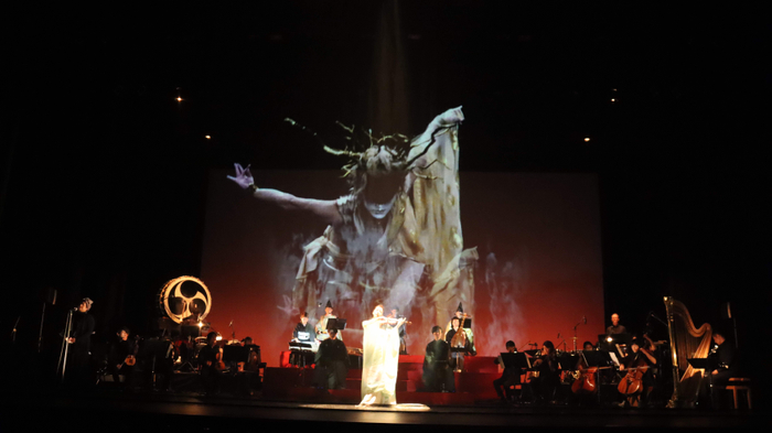 和太鼓が響き、横笛と相まって激しくなる。篠笛・能管や尺八、琵琶、箏、Voice(ヴォーカル)などの響のメンバーが全員揃い、白い着物のようなドレスに着替えた川井が再登場。「赤い月」が始まった瞬間、初めて生で聴く響の音にゾクッと鳥肌が立った。今年3月に発売されたファーストアルバム「響」は、音楽は和楽器、洋楽器と区別する必要はないと感じたほど見事に調和していた。生演奏ではその楽器一つひとつの音の力強さ、奥深さが一斉に押し寄せ、圧倒される。続く「ホワイトレジェンド~『白鳥の湖』より~」では、ヴォーカルをはじめ、お囃子のかけ声や篳篥などが幽玄に響き渡る。そして、「ヴァイオリン・ミューズ」ではヴァイオリンを弾く川井の白くて長いドレスの裾が扇のように舞台に広がり、きらびやかなプロジェクションマッピングが投影される。スクリーンから浮かび上がって舞うダンサーと川井が対峙し、音色が激しさを増す。音楽と映像のみならず、衣装までもが楽曲を紡いでいる感覚で、息をのむほどドラマティックだ。こんなオーケストラは今まで見たことがない。