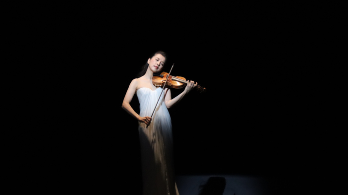 後半も驚きと高揚感は続く。「源氏物語」をモチーフにした「夕顔」では、琵琶の音が鳴り、夕顔に扮した川井がしっとりとヴァイオリンを奏でる。あっと驚くような光源氏の雅な世界が映像でも表現され、観客は平安時代にタイムスリップだ。音が鳴るたびに、それまでどの楽器なのか目で追って確認していたが、もはやそうするのをやめて、ただその世界に身をゆだねてみた。川井が取材で語っていた「和と洋を超えた一つの音楽。その音楽にとって必然ということが大事」とはこのことだろう。必然がこんなにも心地いいものとは。