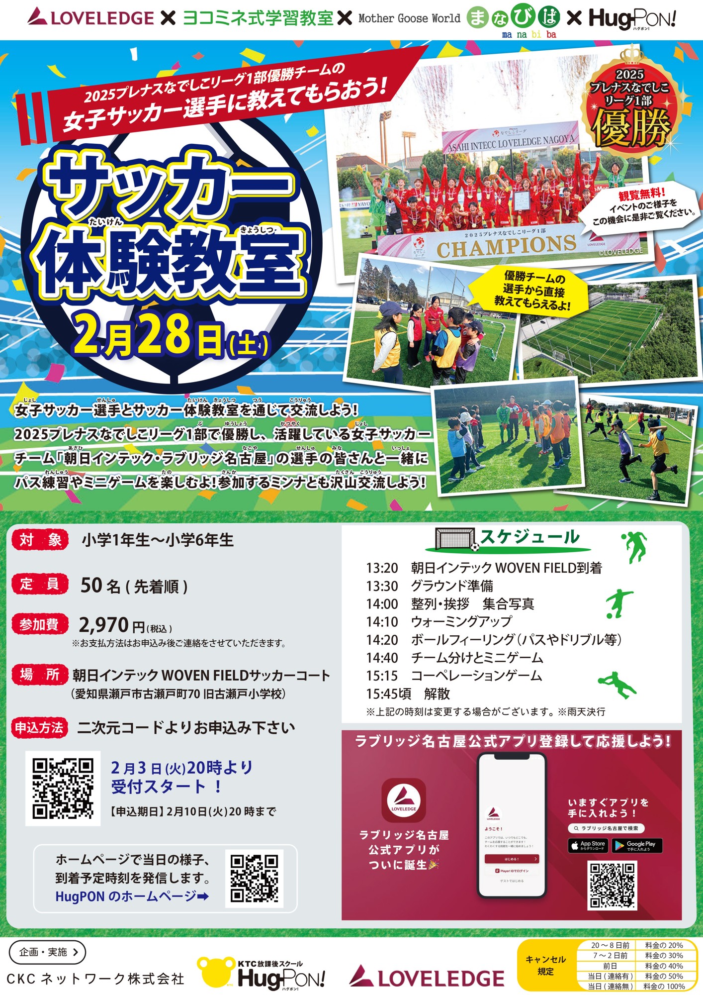 KTC放課後スクールHug₋PON!(運営会社:CKCネットワーク株式会社、代表者:山崎 朋宏)は、2025プレナスなでしこリーグ1部で優勝を果たした女子サッカークラブの朝日インテック・ラブリッジ名古屋(運営法人:株式会社LOVELEDGE、代表取締役:堀田 崇)の選手を講師に招き、会員児童向けのサッカー体験教室を主催します。KTC放課後スクール Hug₋PON!はKTC GROUP[中央出版ホールディングス株式会社 (本社:愛知県長久手市、取締役社長:前田 哲次)を中核とする企業グループ]に属しており、同グループの児童向けサービスからも参加者を募ります。