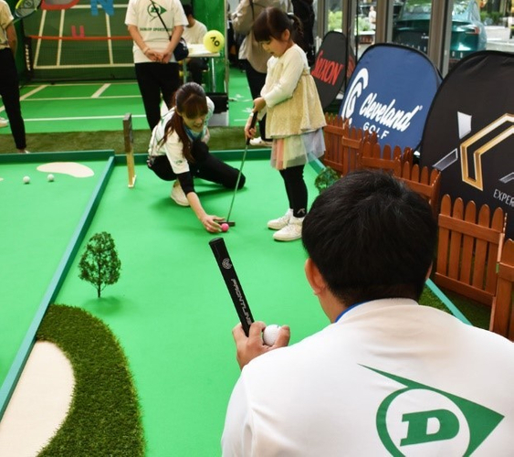 2ホール3球ずつのパターに挑戦。ワンパットで入ったらスリクソンゴルフボールをプレゼントしました。ゴルフ経験者、未経験者問わずチャレンジができ、ゴルフの楽しさを伝えられました。