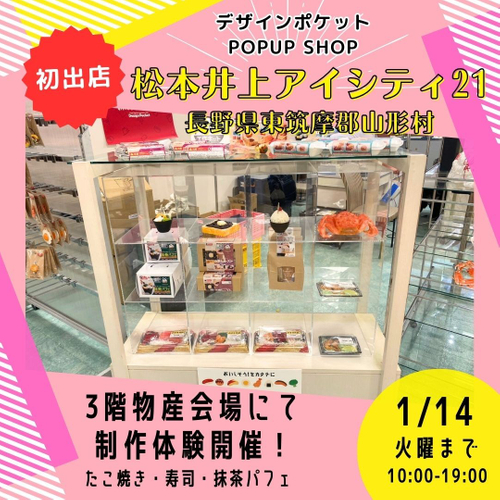 食品サンプル専門店「デザインポケット」は、2025年1月8日(火)から1月14日(月・祝)の期間中、長野県東筑摩郡山形村にある「松本井上アイシティ21」にてポップアップショップを開催いたします。本物そっくりの食品サンプルを間近で見て楽しめるだけでなく、オリジナル作品を作れる「食品サンプル制作体験」も実施します。ぜひこの機会にご家族やご友人と一緒にお楽しみください。