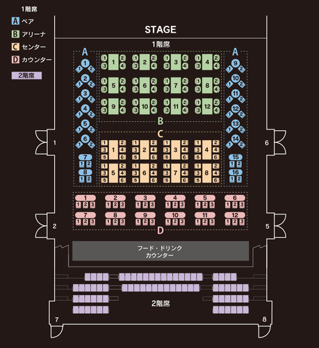ペアシート(2席セット)は19,000円、アリーナ席とセンター席はそれぞれ9,000円、カウンター席は8,500円です。