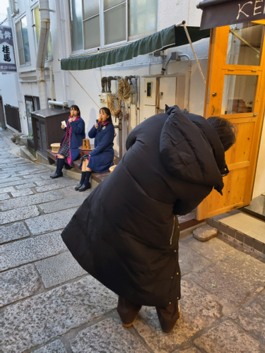 商店街の料理店で絶品グルメに舌鼓を打ちながらシャッターを切る田津原さん。しかしいつしか「食レポギャグ対決」が発生。追い込まれた芸人の姿がここに!