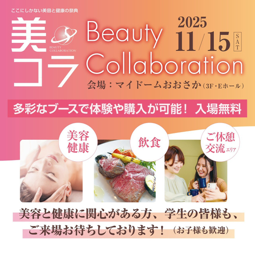 Ruler株式会社 美コラ運営事務局(大阪市中央区久太郎町1-6-21シャンクレール本町4階)では、11月15日(土)10時~17時、マイドームおおさか(3F・Eホール)にて、今までにない美容と健康の祭典Beauty Collaboration(ビューティーコラボレーション)、略称「美コラ」第2回を開催いたします。