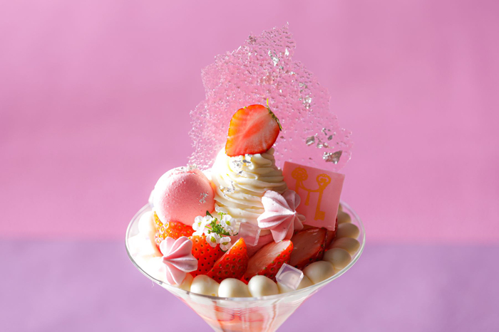 そして、銀箔のついたオパリーヌ(飴細工)、いちごの花を模したエディブルフラワー(食用花)など、見た目も華やかに仕立てることで、写真映えも意識した、パティシエこだわりのパフェに仕上がりました。名古屋に来たら一度は食べるべき、煌びやか且つピンクカラーがキュートな、ご褒美スイーツを存分にお楽しみください。
