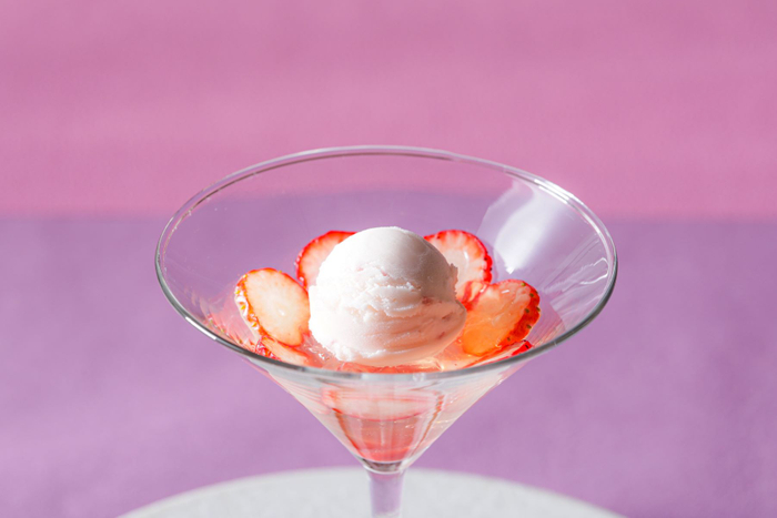 パフェ下段には、桜アイスとフレッシュいちごを配置し、最下部には、ロゼシャンパンと桜のジュレ、いちごソースを取り入れることで、最後の一口までスッキリと、美味しくいただけます。