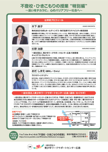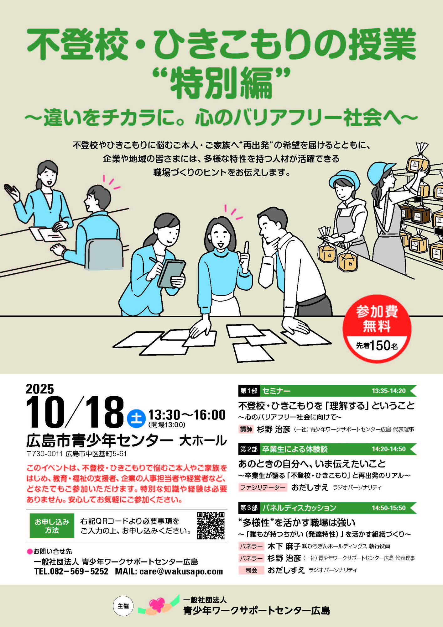一般社団法人青少年ワークサポートセンター広島(所在地:広島市東区、代表:杉野治彦)は、2025年10月18日(土)に広島市青少年センター大ホールにて、不登校・ひきこもりをテーマにした特別イベント「不登校・ひきこもりの授業 特別編」を開催します。【入場無料(事前申込制)】で、当事者やご家族、教育・福祉関係者、企業の人事担当者など、幅広い方が対象です。