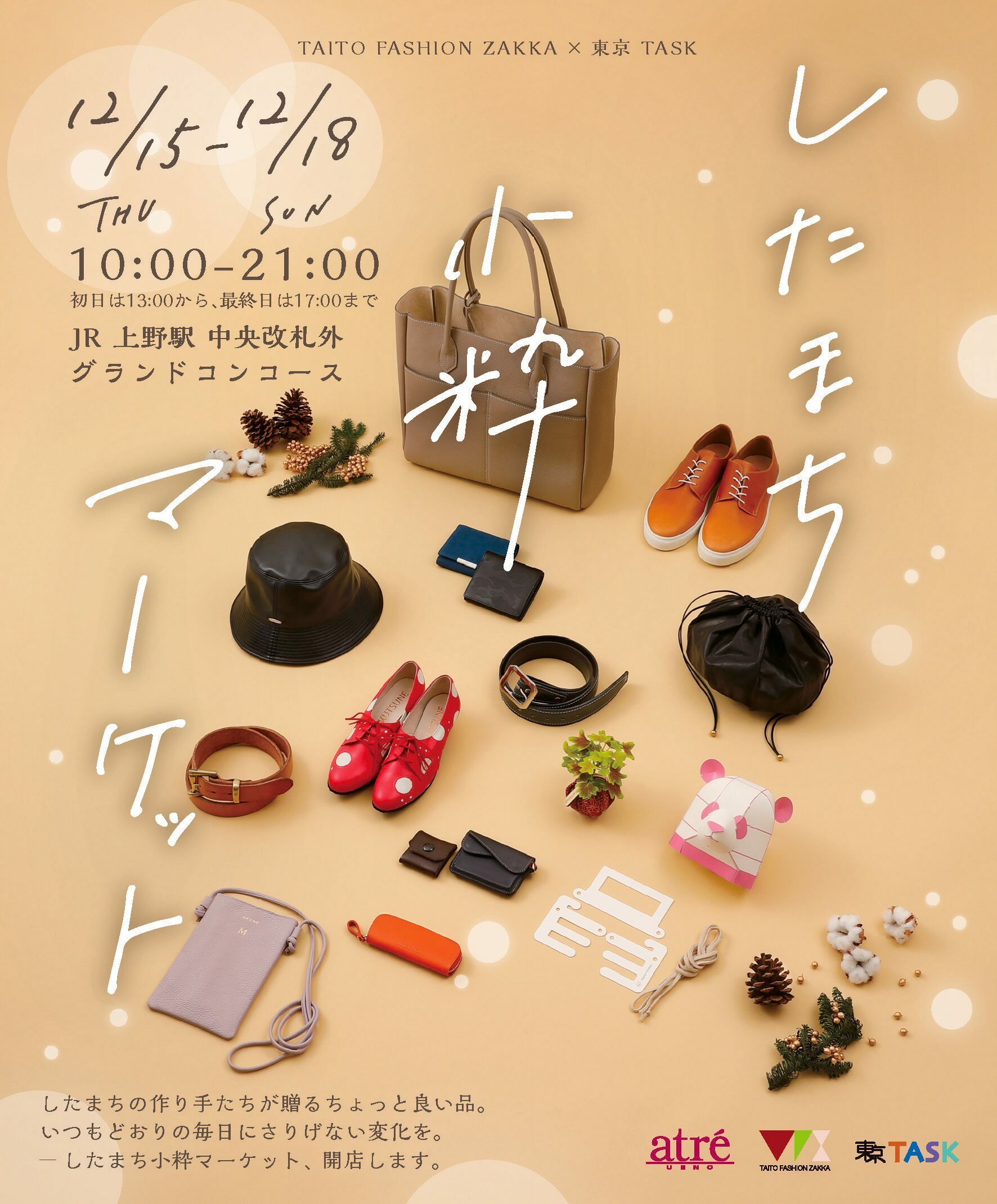 地元・台東区を含む東京の職人が丹精を込めて作った「ちょっと良い品」を集めました。いつもどおりの毎日にさりげない変化を与える革小物や靴、バッグ、帽子などさまざまな商品が揃います。クリスマスギフトや自分へのご褒美に、したまちの「ちょっと良い品」はいかがでしょうか。