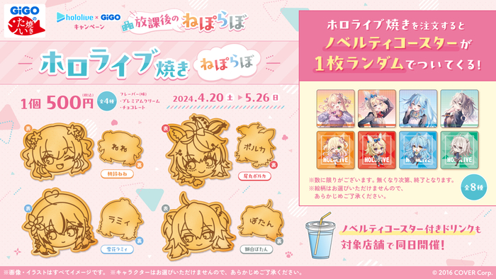 GiGOのたい焼きにて、ホロライブとのコラボたい焼き 「ホロライブ焼き~ねぽらぼ~」を販売いたします。1個お求めの方に、オリジナルコースター(全8種/ランダム)を1つを進呈いたします。