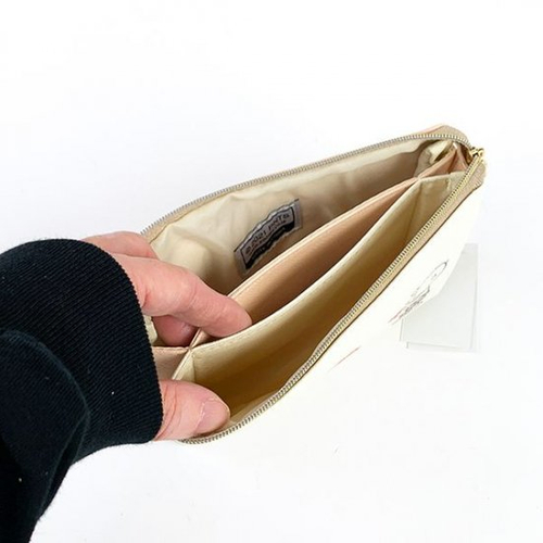 ファスナーを開けると3つに仕切られたポケットがある、人気のタイプです。