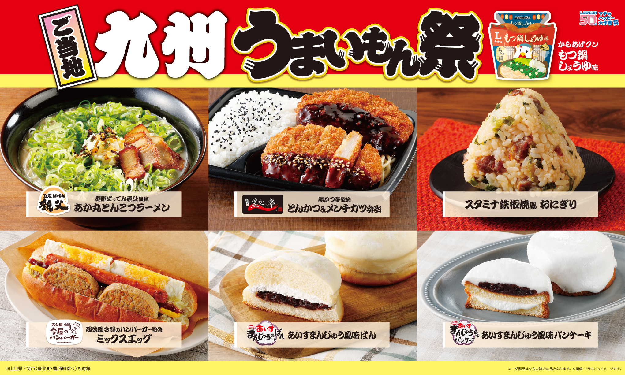 九州および山口県下関市(豊北町・豊浦町除く)のローソン店舗(約1,400店:2025年11月末時点)では、『からあげクン もつ鍋しょうゆ味』のほか、『スタミナ鉄板焼風おにぎり』や、『麺屋ばってん親父監修 あか丸とんこつラーメン』、丸永製菓のあいすまんじゅうをイメージしたスイーツや菓子パンなど計8品を発売いたします。