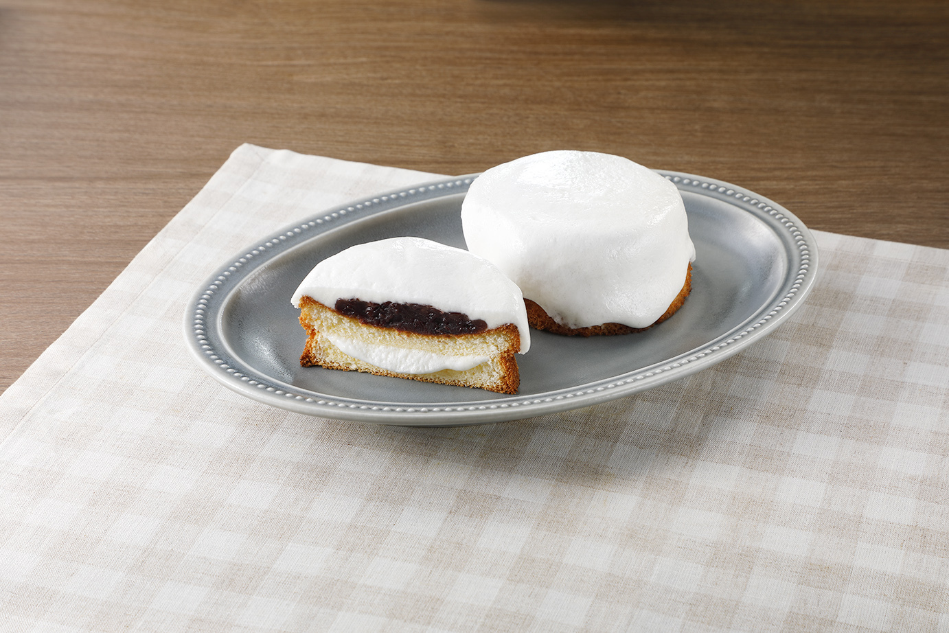 福岡県久留米市の丸永製菓が生んだ、九州で愛されるロングセラー商品「あいすまんじゅう」とのコラボ商品です。やわらかい小豆あんと練乳風味のバニラアイスが特徴の「あいすまんじゅう」をイメージしてつぶあんとミルク風味のホイップをサンドした、ふんわりとした食感の白い菓子パンです。