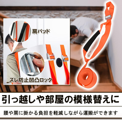 特別な技術や体力を必要としない運搬ベルトは、女性やシニアの方でも洗濯機・冷蔵庫・大型段ボールを一人で運搬できる優れもの!この便利なアイテムを手に入れて、重い荷物を運ぶ際のストレスを軽減して作業の効率化を図りましょう。