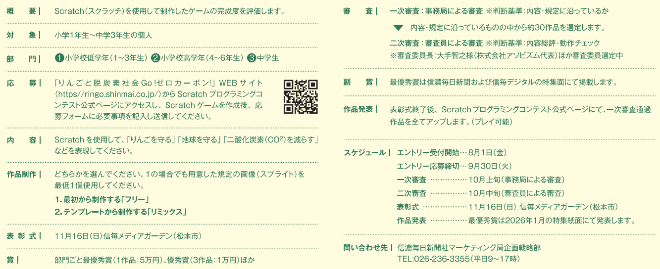 信濃毎日新聞社(長野市)は、「Scratch プログラミングコンテスト~信州りんごの未来を救え!~」の作品を募集しています。小学1年生から中学3年生までが応募でき、最優秀作品には賞金5万円、優秀作品には賞金1万円を贈呈するほか、webサイトや新聞紙面にて紹介させていただきます。