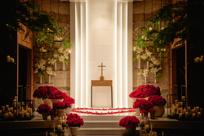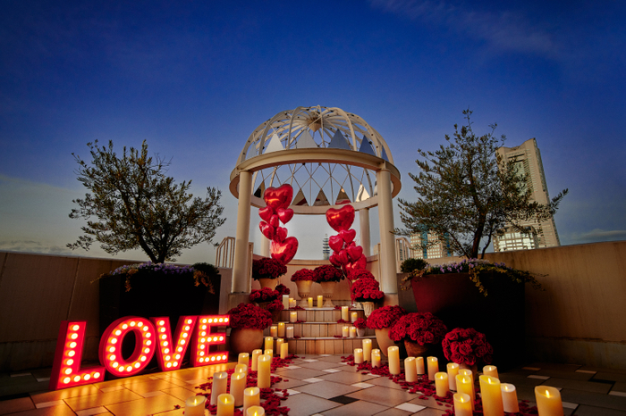 チャペルの祭壇を彩るのは、1,000本の大輪の赤バラ(アートフラワー)。普段は入ることのできない「チャペル」という神聖な空間を、まるでふたりを主役とした映画の舞台のようにドラマティックに彩ります。ステンドグラスが美しい重厚なチャペル、夜景が美しく輝くガラスのチャペルなどに加え、緑あふれるガーデンや、水辺のテラス、屋上のガゼボなどにも設置可能なので、日常の何気ない空間が、プロポーズのための特別な空間へと生まれ変わります。