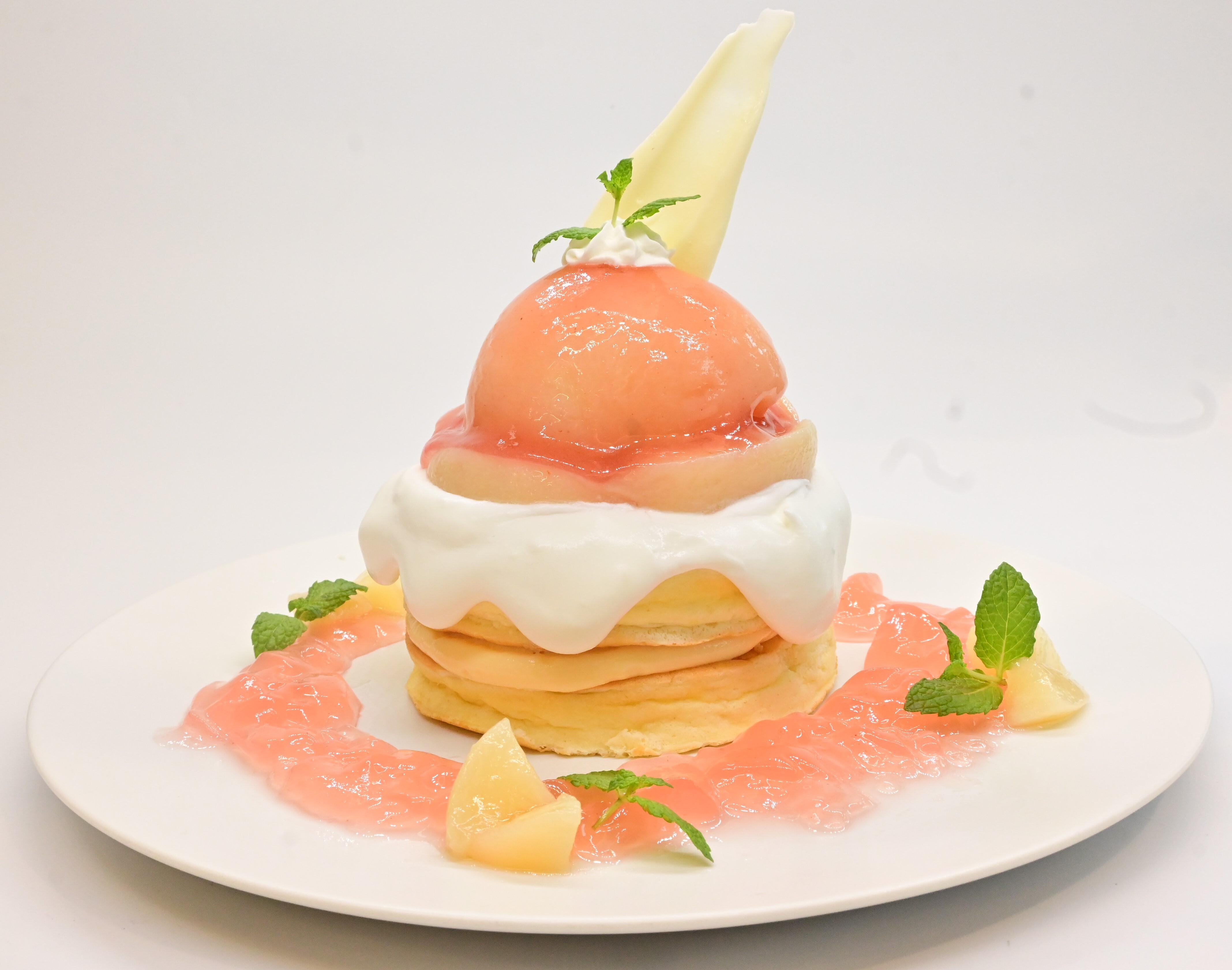 徳島県産の桃を丸ごと1個分使用した大満足のパンケーキ。ふわっふわの2段のパンケーキの間にカスタードクリームとバニラアイス、上には生クリームとピーチソルベ、半身の桃を乗せました。熱い夏でもペロリと食べられるパンケーキに仕上げました。