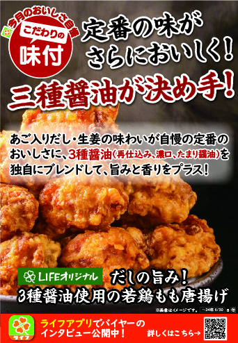 惣菜コーナーで人気常連の唐揚げ。ライフでは6年連続金賞以上を受賞している“むね肉”を使用した名物の「純和赤鶏むね塩唐揚げ」がありますが、実は“もも肉”を使用した唐揚げも大人気!その若鶏もも唐揚げを、毎日食べても飽きずさらに若鶏もも肉の旨みをアップさせるためにこだわりの3種の醤油を合わせ、「だしの旨み!3種醤油使用の若鶏もも唐揚げ」を完成させました。