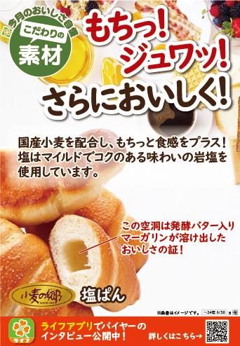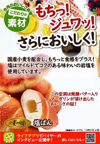 小麦の郷の「塩ぱん」は昨年より1.2倍に売上が伸びている人気商品。夏に向けて塩ぱんのニーズが高まるこの時期に、さっくり食感にプラスして最近のトレンドになりつつある「もちっと感」を加え、さらにおいしく仕上げました。
