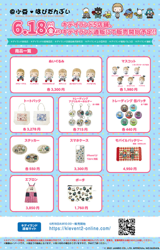 【「2021年サンリオキャラクター大賞」コラボ部門1位を受賞!】2021年6月18日(金)~発売!「@小豆×はぴだんぶい」@キデイランド5店舗 株式会社キデイランド 2021-06-08 17:00 ・「トレーディングアクリルキーホルダー」「トレーディング缶バッジ」はおひとり様1会計各3点まで ・上記以外はおひとり様1会計各1点まで(キャラクター・デザイン違い商品は各1点ずつまで) でのご購入制限をさせていただきます。ご了承くださいませ。 「@小豆×はぴだんぶい」 開催店舗一覧 関東 原宿店 中部 上小田井店 関西 大阪梅田店 / 京都四条河原町店 九州 福岡パルコ店 通販は、こちらのサイトから 6/18 10:00~ 商品に関するお問合せは、上記各店まで ジャンル: エンタメ アニメ・ゲーム タグ: @小豆 はぴだんぶい サンリオ サンリオキャラクター大賞 タキシードサム ハンギョドン けろけろけろっぴ ポチャッコ あひるのペックル バッドばつ丸 UUUM 画像一覧 一括ダウンロード