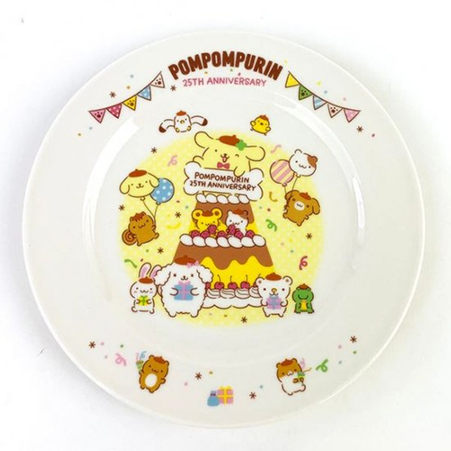プレート全面に、ポムポムプリンを始めとするキャラクターたちが25周年をお祝いしている楽しいデザインが描かれています。