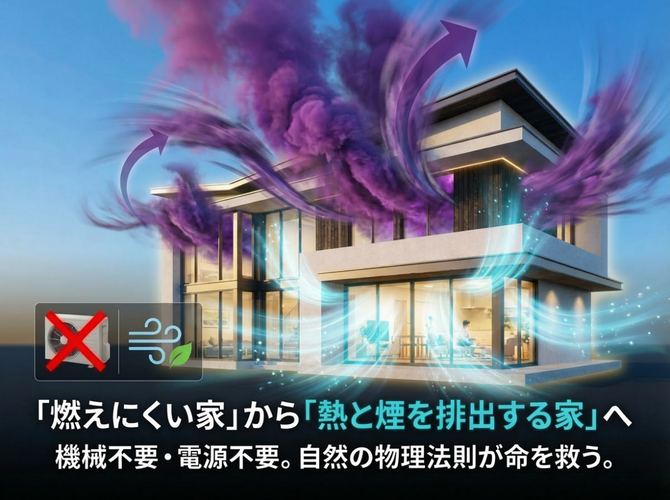 核心は「窓の科学」——住宅の間取りと窓配置を、**火災動力学シミュレーター**を用いて科学的に解析し、自然対流の力を最大化する開口部配置を設計する技術である。
