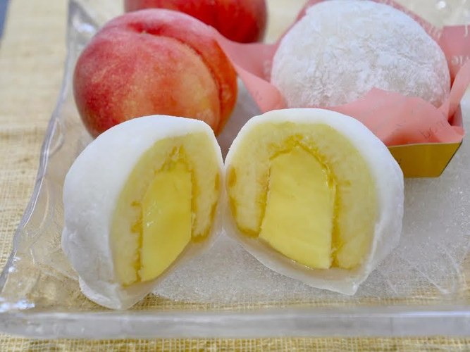 まるごとの桃の種を取り除き新鮮なカスタードクリームをたっぷり詰め込み自家製白あんで蓋をして、ミルク入りのお餅で包んだ当店オリジナルの大福です。