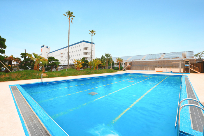また、敷地内にはご宿泊者様限定で、無料でご利用いただけるプールもございます。大人用プールのほかにお子様用の水深の浅いプールもあるので、小さなお子様も安心してお楽しみいただけます。海もプールも楽しみたいアクティブなファミリーやグループ旅行におすすめの宿です。
