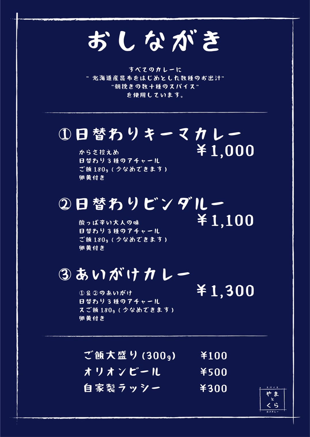 500軒以上のカレー店を食べ歩いた店主が、新たにカレー専門店をオープンしました。本格的なスパイスカレーをもっと身近に楽しんでいただけるよう、日本人の味覚に寄り添う“出汁”をベースに、ひと皿ひと皿心を込めてお作りしています。