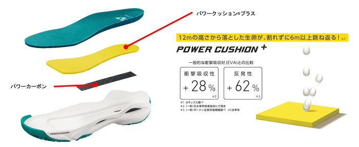 ヨネックス独自の衝撃吸収素材「パワークッション®プラス」は反発性の高い特殊樹脂に格子状の溝を最適な間隔と深さで配置し、衝撃吸収性を28%※2、反発性を62%※3向上させ(一般的な衝撃吸収材[EVA]との比較)、12mの高さから落とした生卵が、割れずに6m以上跳ね上がる※1衝撃吸収反発素材です。