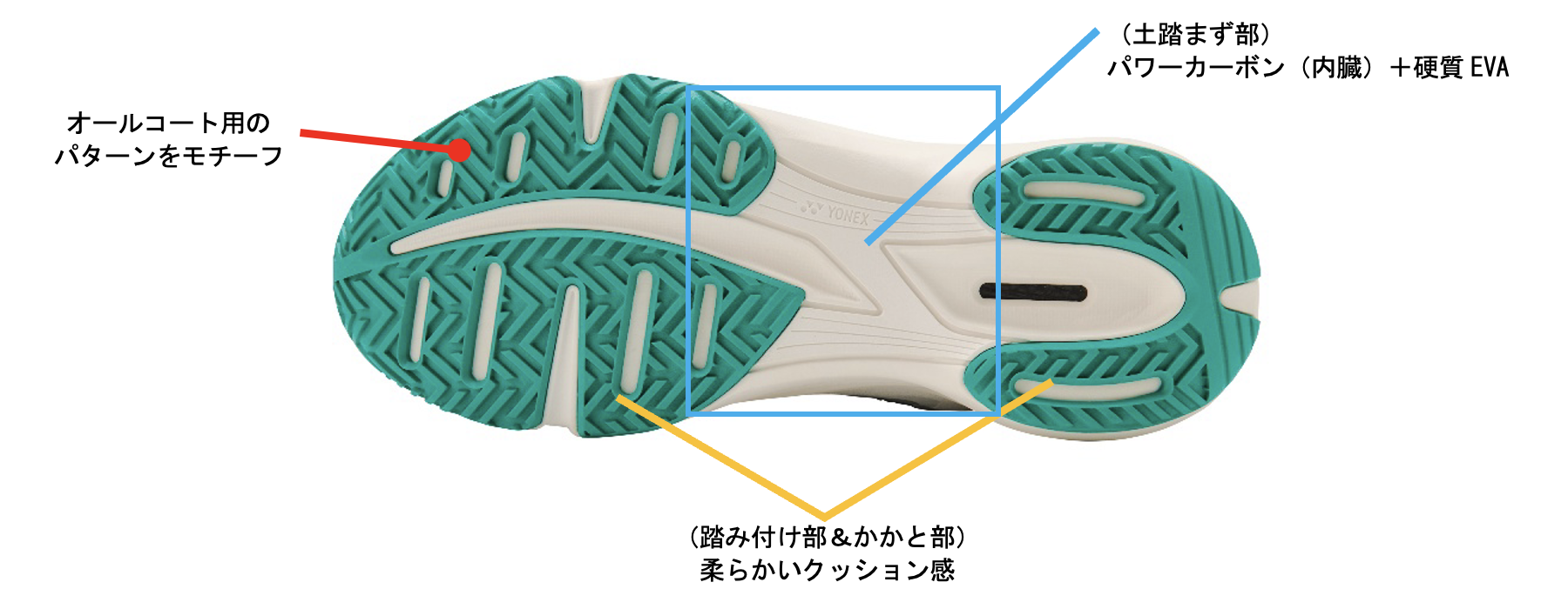 また、ミッドソールにヨネックス史上最軽量フォーム材「FEATHER LIGHT®X(フェザーライトX)」を採用し、踏み付け部とかかと部の柔らかいクッション感を実現。土踏まず部には硬質EVAを使用、内蔵したパワーカーボンとの相乗効果でねじれを抑制します。