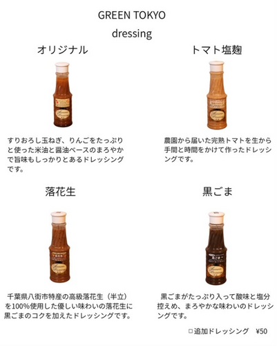 当店では「朝採れ野菜をその日のうちにお客様へ」をコンセプトに、収穫したての新鮮な野菜を提供。野菜本来の美味しさを活かすため、無添加の自家製ドレッシング(4種類)をご用意しております。サラダと一緒に、おにぎりも楽しめるランチスタイルで、体にやさしい食事をお届けします。