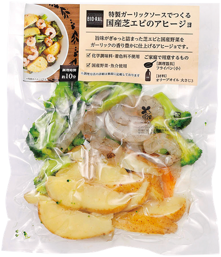 げるアヒージョのミールキット。フライパンで炒めるとエビが赤く色づくので、簡単・便利に食卓を彩ります。クリスマスパーティーにもぴったり。