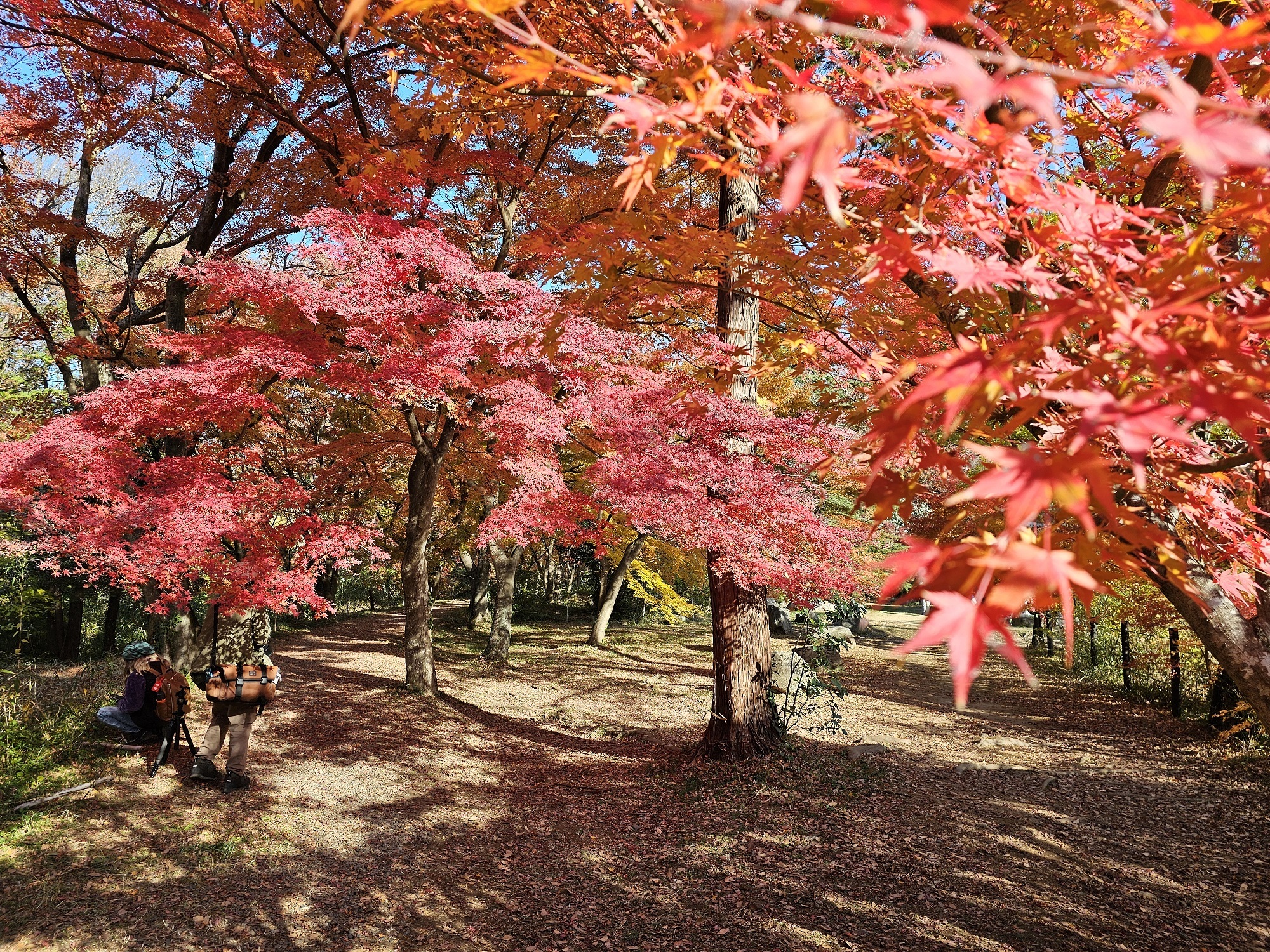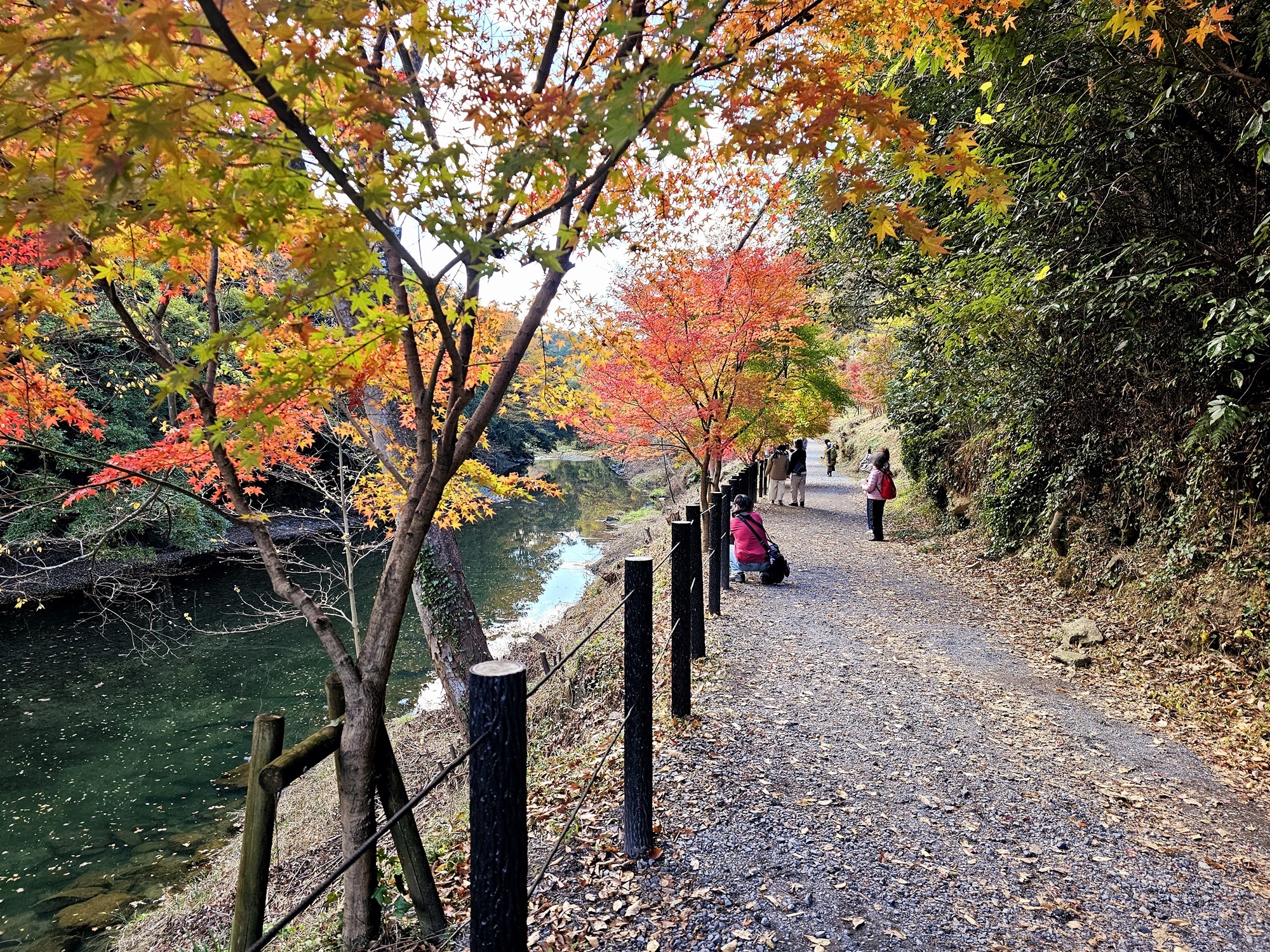見どころは、槻川を大きな石で渡る「飛び石」周辺、展望台周辺、展望台から与謝野晶子歌碑へ向かう遊歩道。新緑はもちろん、秋にはイロハモミジ、ハウチワカエデ、コナラ、クヌギなど赤や黄色に色づき、色とりどり華やかな木々が水面に映る彩りを楽しめます。遊歩道も整備されており、都心から1時間とは思えない景色や鳥のさえずりに癒されます。