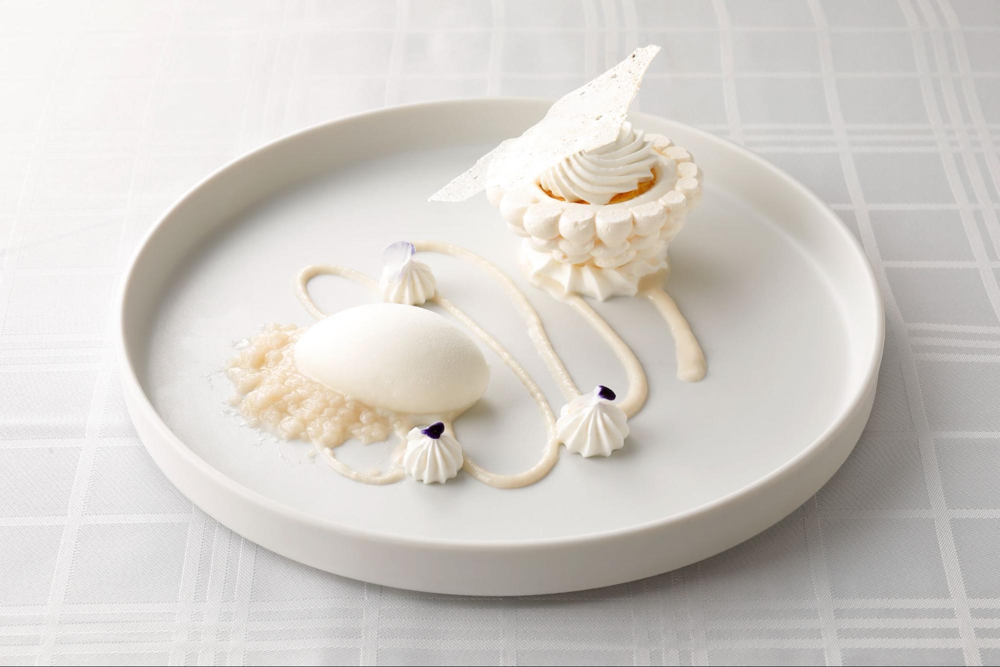 【「リコッタチーズとヨーグルトクリームのムラングシャンティー~甘酒のソースアーモンドミルクアイスを添えて~」三浦 有生さん(フランス料理ビストロやま)】