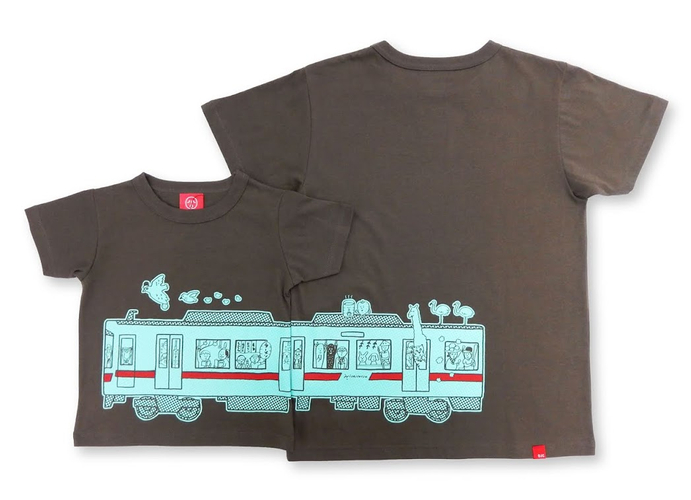 モチーフとなった車両は西鉄7050形。車内には天神の屋台や太宰府の梅、動物園のラマに明太子など西鉄沿線にゆかりのあるものが次々と登場します。また、前後で電車が繋がるデザインと子供から大人まで豊富なサイズ展開により、親子や兄弟でお揃いでの着用も可能です。