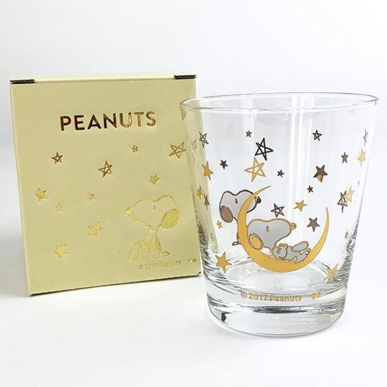星や月のデザインとともに、スヌーピーが描かれている幻想的なグラスです。