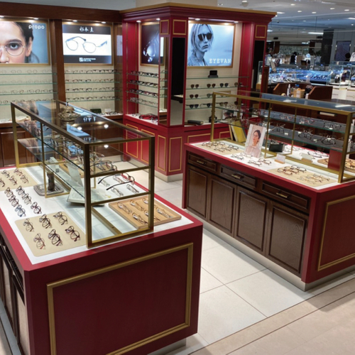 赤を基調としたデザイナーズ店舗で、今注目のブランドを数多く新規導入し、トレンドを意識したスタイルでメガネをファッションのアイテムとして身に着ける楽しさをご提案します。