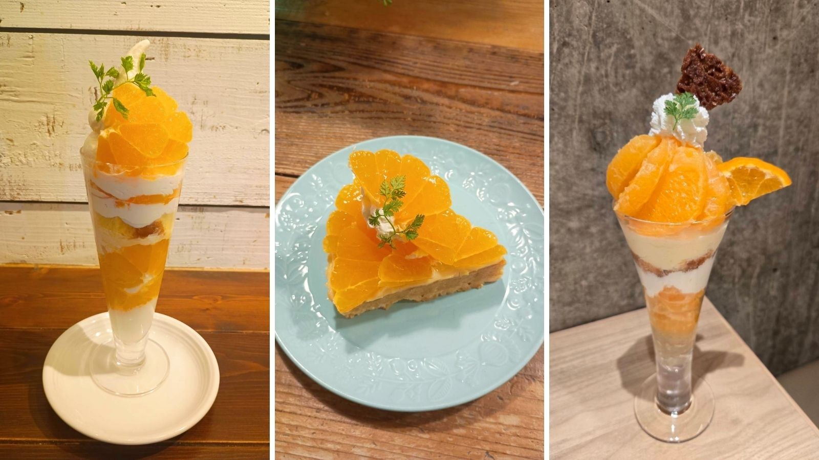 左から鹿児島県大将季のソフトクリームパフェ 1,419円 、鹿児島県産大将季のタルト 869円(みのりカフェ福岡パルコ)、鹿児島県産大将季とレアチーズ風パフェ 1,496円 (みのりカフェアミュプラザ博多)