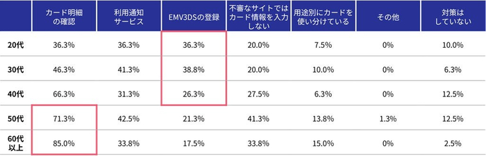 ⑤不正利用対策として最も多かったのは「利用明細のチェック」で、61.0%が実施しており、EMV3-Dセキュアの登録は28.0%だった。