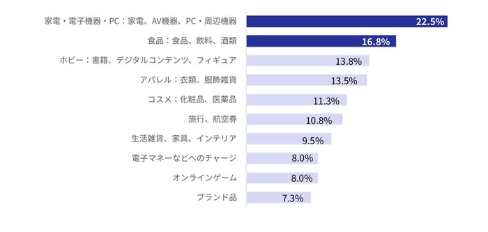 ①クレジットカード不正利用の対象商品は、「家電・電子機器・パソコン」が22.5%、次いで「食品・飲料・酒類」が16.8%と多かった。