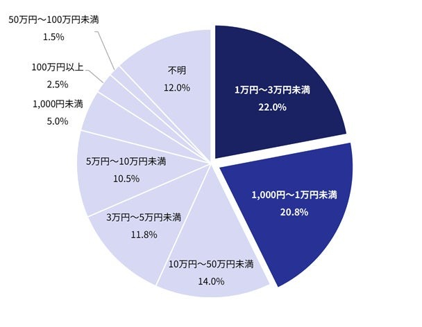 不正利用による被害額では、「1万円~3万円未満」が22.0%、「1,000円~1万円未満」が20.8%と、1,000円~3万円未満の被害が全体の42.8%を占めました。前回調査(47.1%)と同様に、比較的少額な被害が多数を占める傾向は変わっていません。
