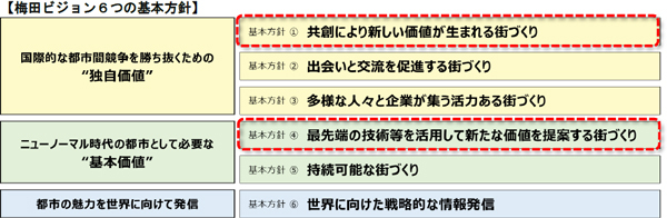 本取組みは、梅田ビジョンに掲げる基本方針(1)・(4)の街づくりを目指しています。