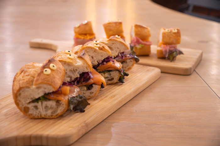 メイン料理は牛ステーキですが、半分に切ったフランスパンの間にサーモンと生ハムを舌のように挟んだ前菜など、ハロウィンらしく愛嬌たっぷりのお料理をたくさんご用意します。