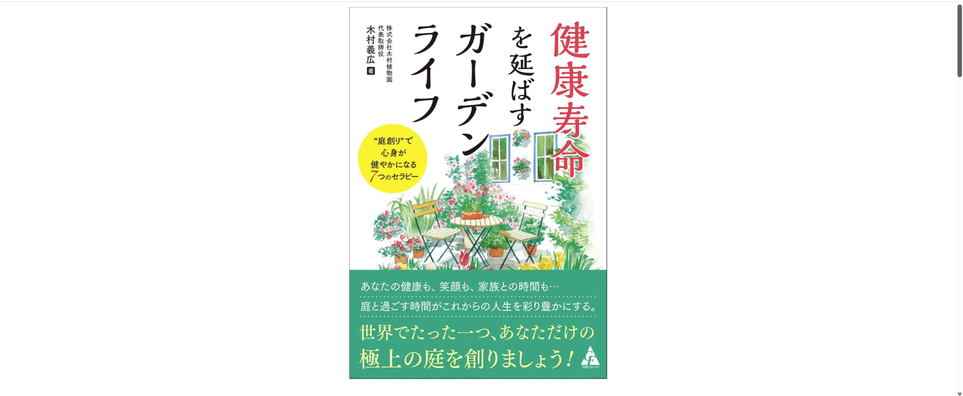 現代は寿命が延びる一方で、心身ともに自立して生活できる「健康寿命」の延伸が急務となっています。著者の木村は、長年の造園実績の中で「緑の中にいる人は笑顔になり、若々しくなる」ことを確信。本書では、自宅の庭を「世界でたった一つの癒やし空間」に変え、健康を守るための「7つのセラピー」を公開しています。