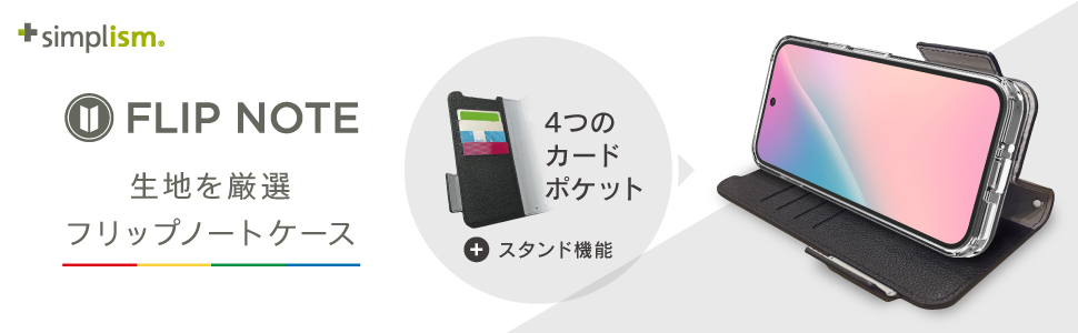 手帳部分は耐久性や質感を高めたSimplismオリジナルのレザー調素材を採用。ベースに強靭な不織布を使用し、生地全体の強度を向上。通常のPUレザーに比べて高い耐水性能と耐久力を発揮します。また、4つのカードポケットが付いています。フタを閉じたまま通話も可能で、画面の皮脂汚れも防ぎます。