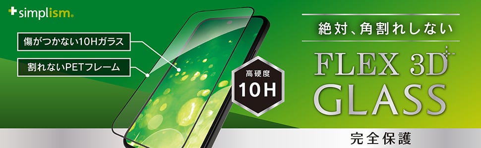Simplismの画面保護ガラスの中で1番売れている[FLEX 3D]シリーズ。絶対角割れしない、強化ガラスとPETフレームの複合構造のガラスプロテクターです。強化ガラスで画面を保護し、端末形状に沿った立体成型のPETフレームが周りを覆うことで、角からの落下や衝撃で起こる角割れを防ぎます。