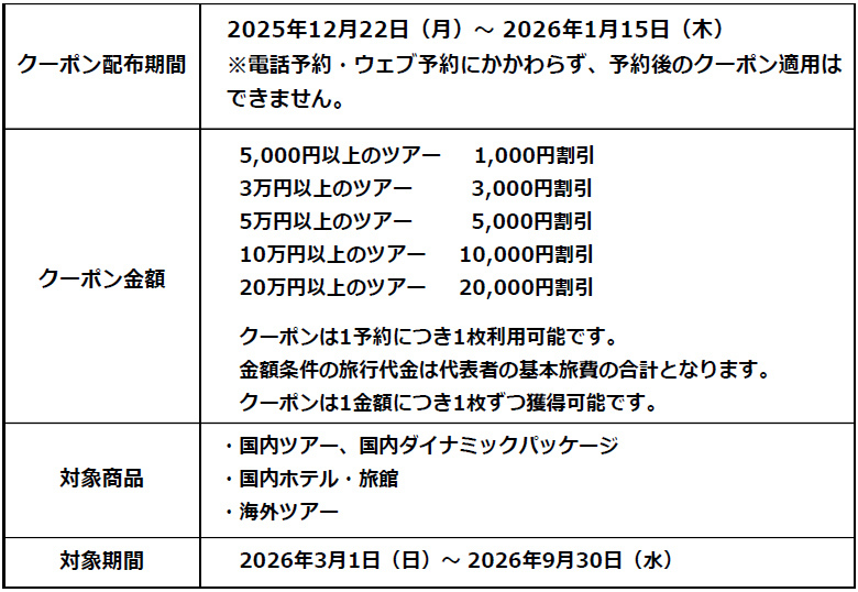 株式会社阪急交通社(大阪市北区梅田 代表取締役社長 酒井淳)は、新年を迎えるにあたり、12月22日(月)から「福たびフェア2026」を実施します。当社ウェブサイトを通じて、国内旅行・海外旅行を予約する際に利用可能な「旅行割引クーポン」※1(以後、クーポン)を配布し、旅行需要の促進に取り組みます。