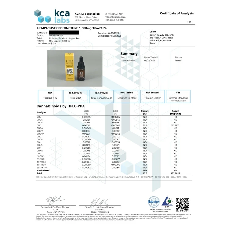 パッケージのQRコードにて、製造ロットごとの成分分析証明書(CoA)を公開。いつでも、お手元の製品の信頼性を確かめることができます。