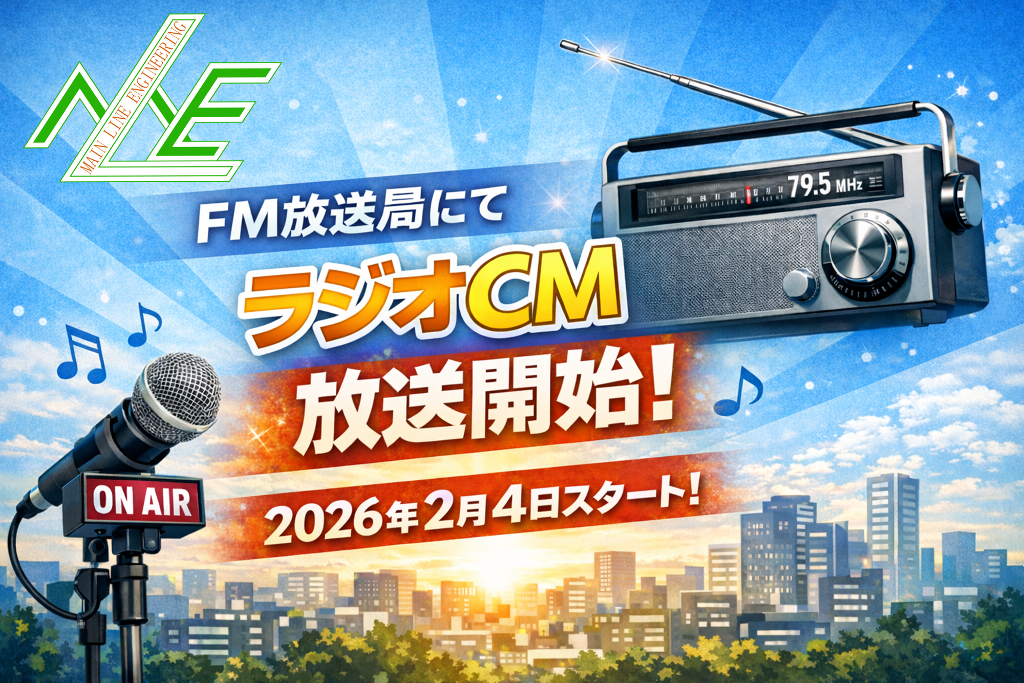 高速道路の発注者支援業務を担う株式会社メインライン・エンジニアリング(本社:神奈川県横浜市、代表取締役:坂田光秋、以下当社)は、2026年2月4日よりFMラジオ局「FM NACK5(79.5MHz)」にて企業認知度向上を目的としたラジオCMの放送を開始しました。当社は高速道路のインフラ整備・保全点検・施工管理を担う発注者支援業務を通じて社会に貢献してきましたが、インフラの老朽化が深刻化する中、より多くの方々に当社の取り組みと「100年先の未来を共に育む企業でありたい」という想いを伝えています。