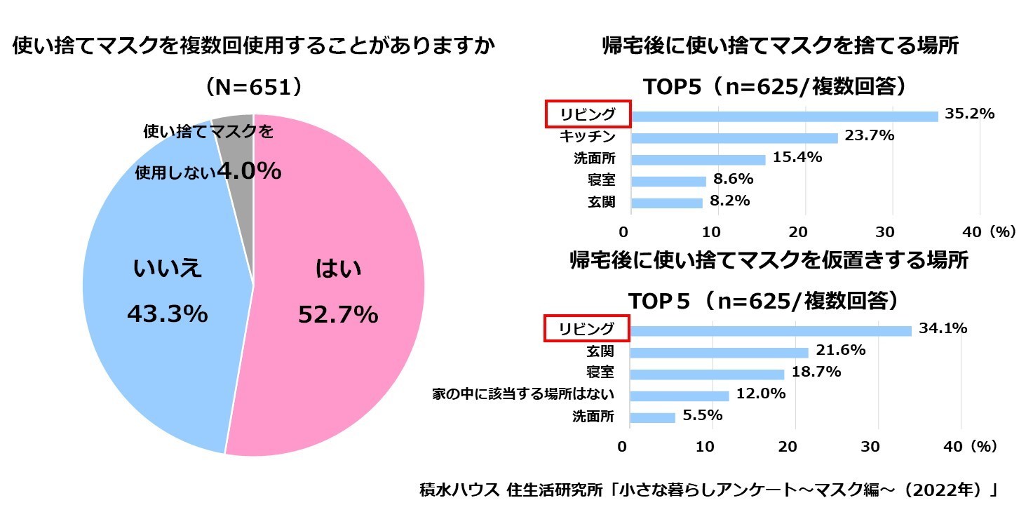 コロナ禍の感染症・風邪の予防で欠かせないマスクの自宅における取り扱いはいかがでしょうか。住生活研究所による「小さな暮らしアンケート~マスク編~(2022年)」(対象 全国の20~60代の男女(N=651))では、52.7%と半数以上が「使い捨てマスクを複数回使用することがある」と回答しました。また、使い捨てマスクの帰宅後の扱いについて、捨てる場所/仮置きする場所どちらにおいても約3人に1人が「リビング」という結果になりました。続いて多い場所として、捨てる場合は「キッチン」(23.7%)、仮置きする場所は「玄関」(21.6%)でした。